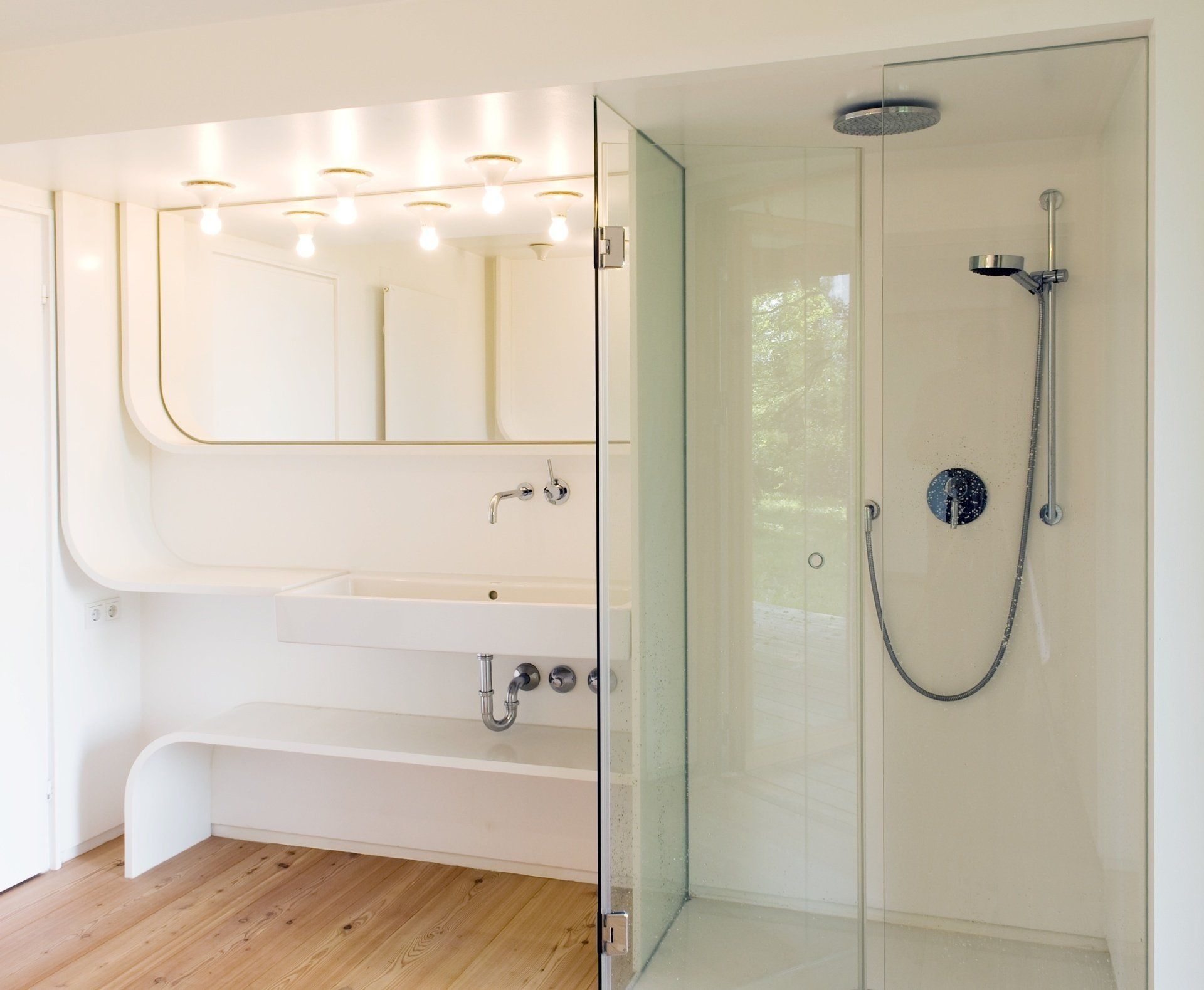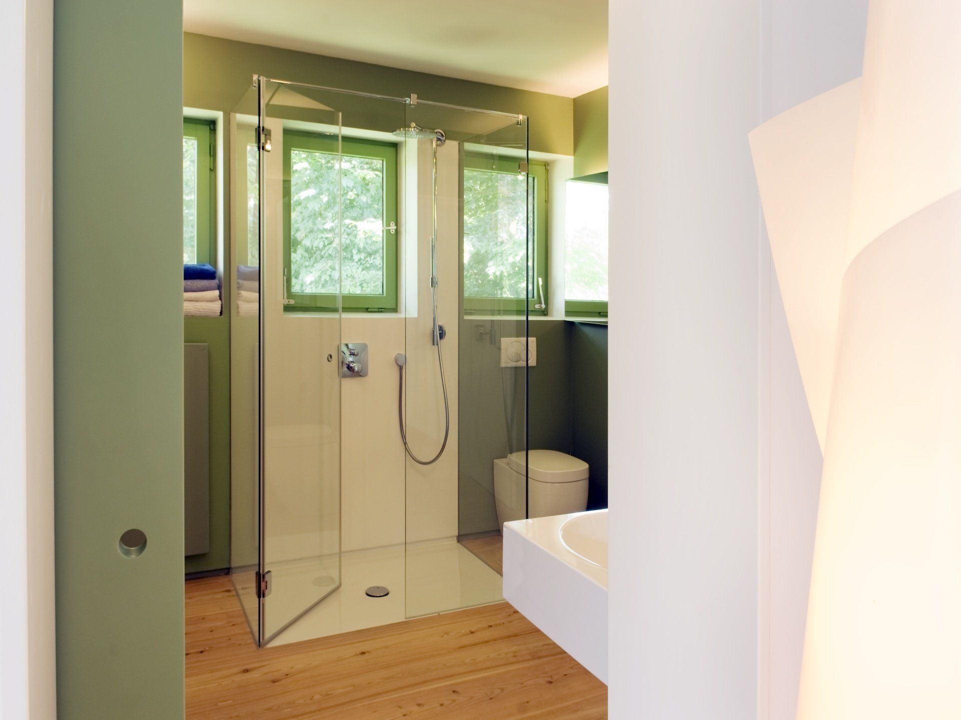 Das obere Bad, vor den Fenstern von einem dichten Blätterwald umgeben, ist ganz in grün gehalten. Das untere Bad mit Austritt zum Garten betont die Rundungen der Einbaumöbel, die einzige Farbe bleibt weiss. Beide Bäder leben von Flächen und Farben und verzichten komplett auf Fliesen. Bei weiteren Einbaumöbeln kamen ebenfalls die Materialien Lärchenholz, Linoleum und Leder zum Einsatz, im Vordergrund stand immer eine geerdete, wohnliche Atmosphäre mit einer selbstverständlichen Formensprache.