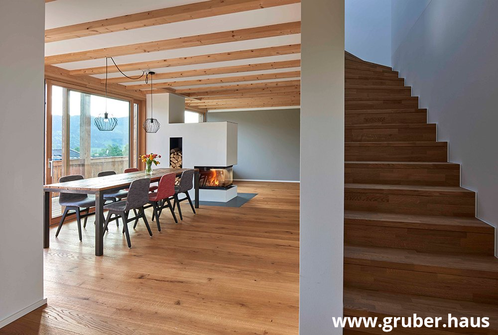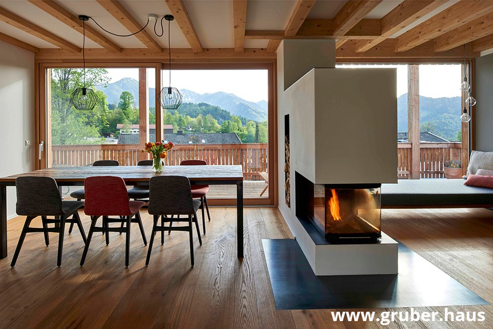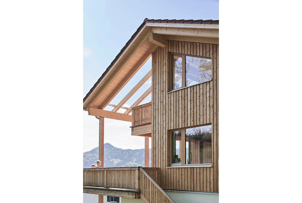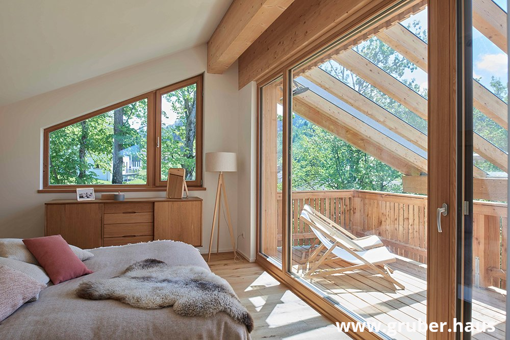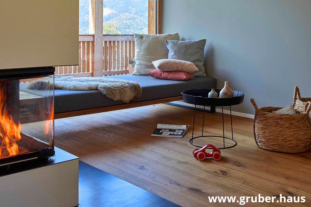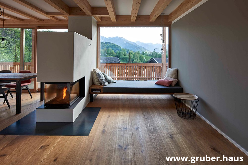 Als “absolute Gartenmenschen“ war unseren Bauherren auch ein hoher Außenbezug der Wohnräume wichtig. Das “wir wollen Sonne“ schlägt sich in einer großen, an die Küche anschließenden Terrasse ebenso nieder, wie in den direkten Gartenzugängen der im Untergeschoß befindlichen Schlafräume. Oberhalb eines weiteren Balkons im Dachgeschoss sorgt eine große Dachverglasung für maximalen Ausblick aus dem Elternschlafzimmer. Im weitläufigen Wohnbereich im Erdgeschoss bildet ein Ofen den zentralen Punkt des Wohnhauses. Wenn man im Winter vom Skifahren durchgefroren nach Hause kommt, wird man seine wohlige Wärme zu schätzen wissen.