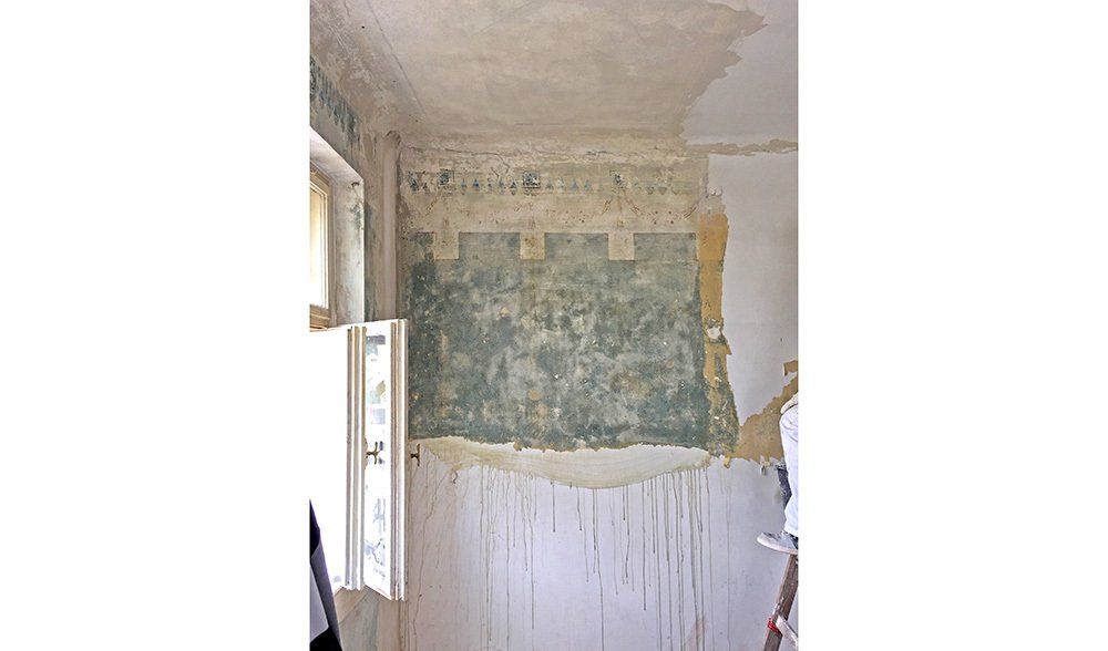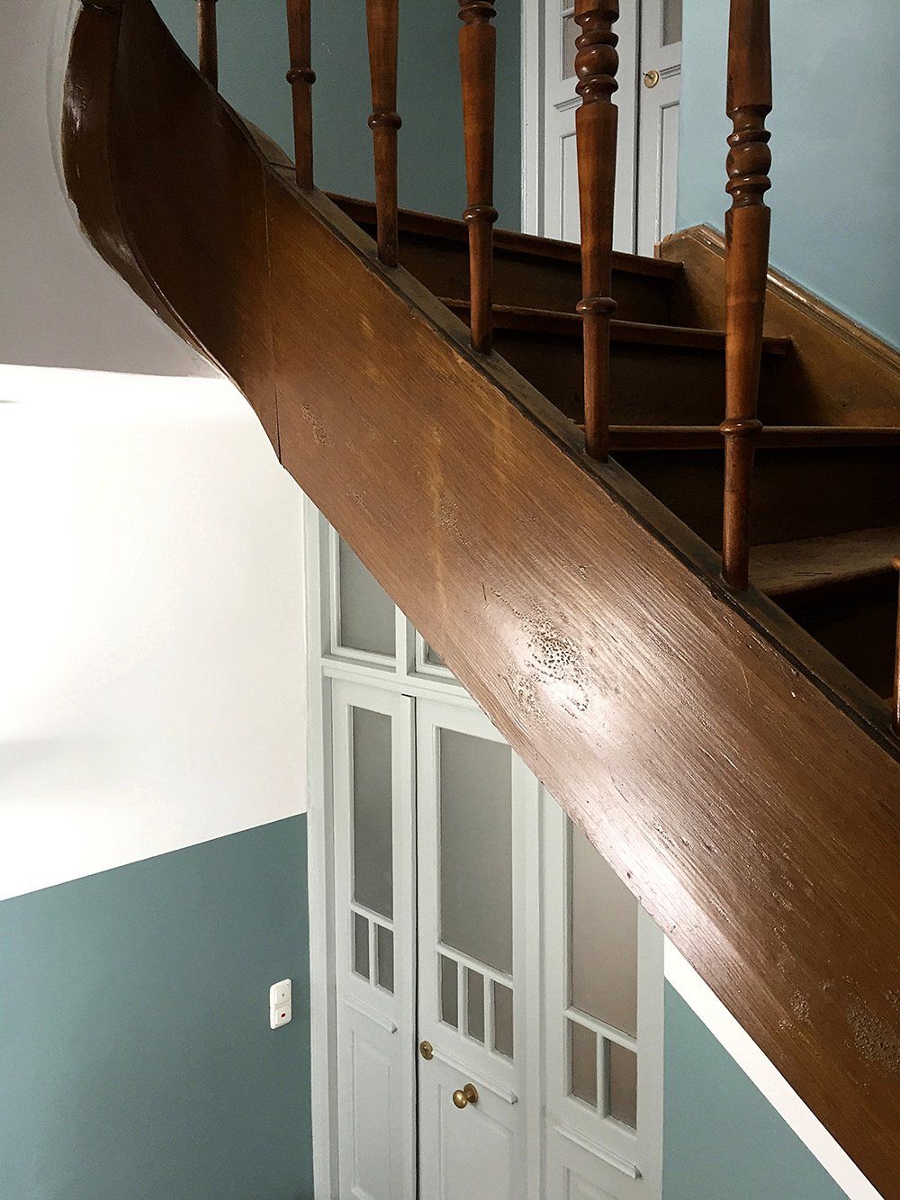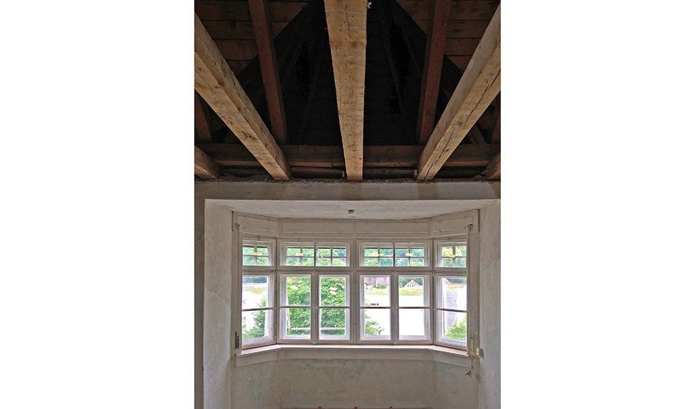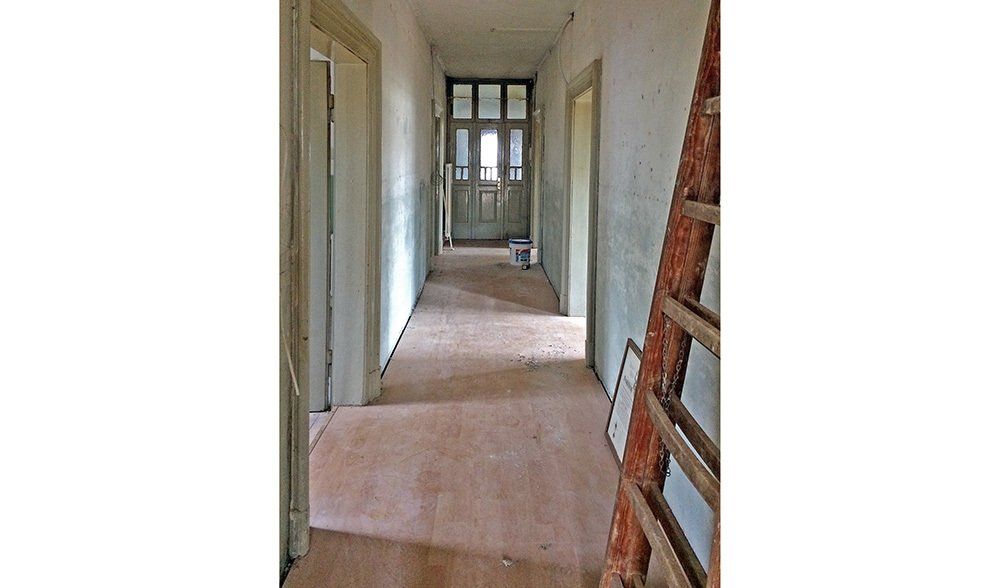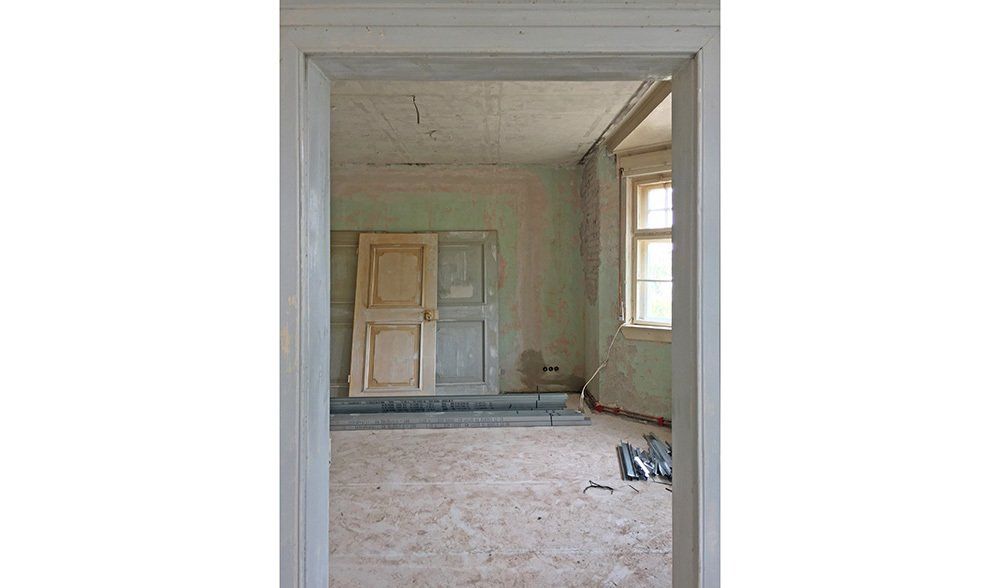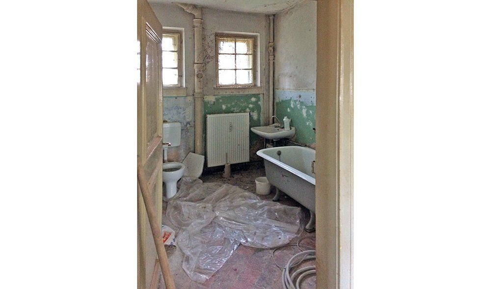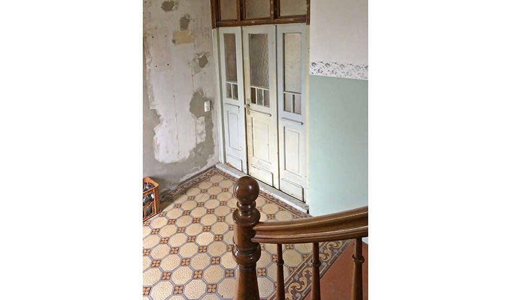 In den unteren Geschossen hatte schon längere Zeit niemand mehr gewohnt. Der Efeu eroberte das Bad im Erdgeschoss auch auf der Innenseite, einige Fensterläden hingen recht schief in ihren Angeln und der Versuch, das Erdgeschoss elektrisch auf den neuesten Stand zu bringen, war irgendwann, einige Staubschichten vorher, stecken geblieben. Unter diesen Staubschichten schlummerten in allen Ecken Schätze. Architektonische Schätze: hier ein altes Kastenschloss an den Innentüren, dort ein schöner Fliesenboden versteckt unter brüchigem Linoleum, ein original erhaltenes Eichen-Fischgrätparkett, die schmiedeeisernen Geländer oder die alten Kastenfenster mit ihren handgezogenen Glasscheiben. Für uns, die wir die Qualitäten alter Gemäuer