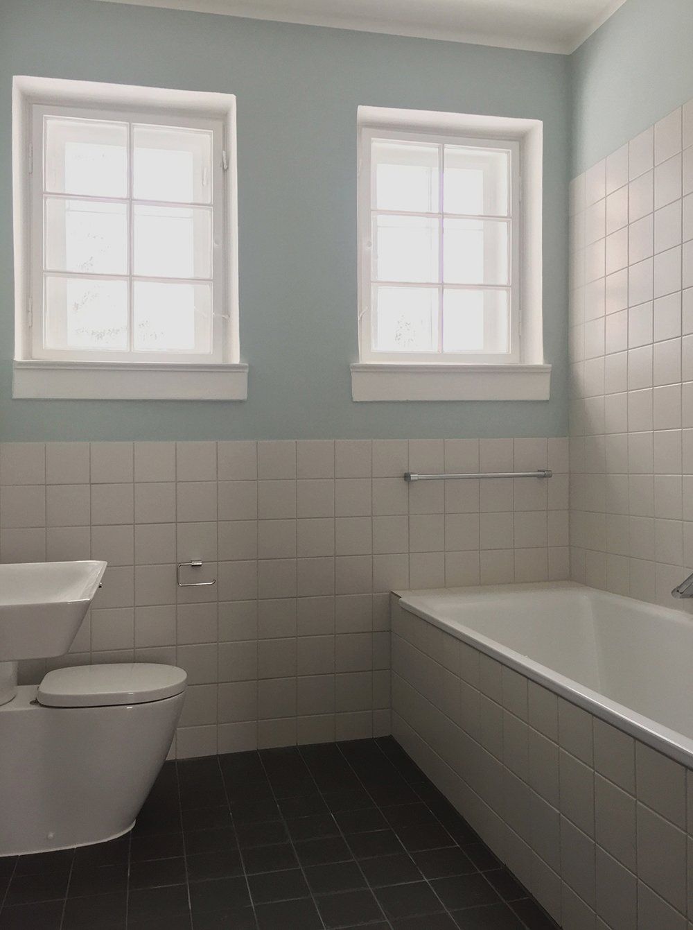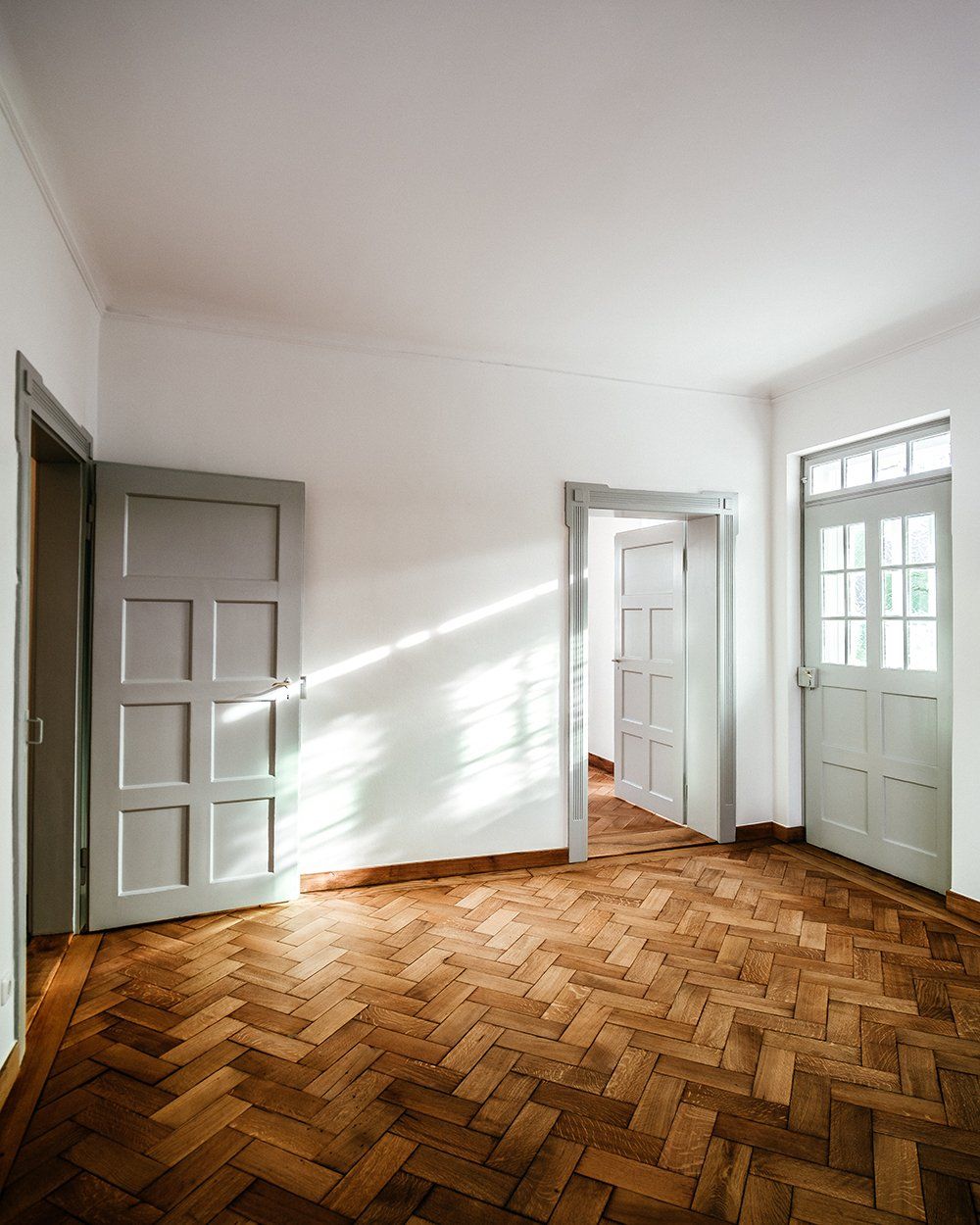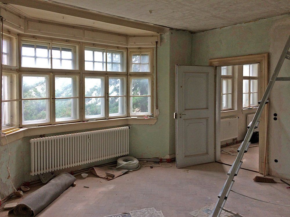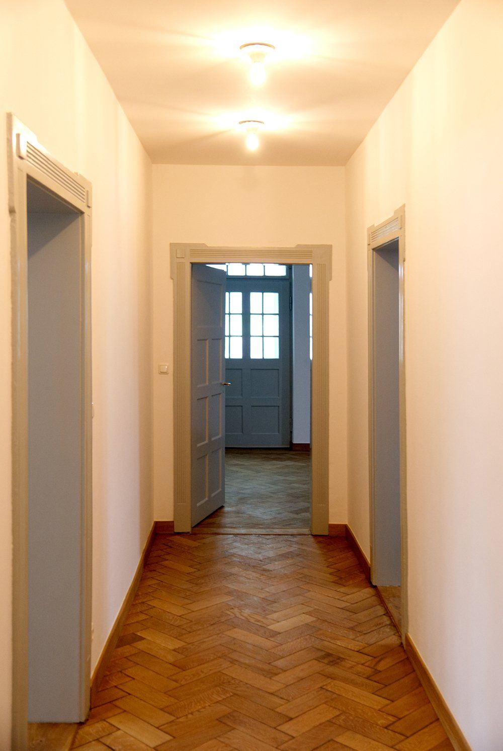 In den unteren Geschossen hatte schon längere Zeit niemand mehr gewohnt. Der Efeu eroberte das Bad im Erdgeschoss auch auf der Innenseite, einige Fensterläden hingen recht schief in ihren Angeln und der Versuch, das Erdgeschoss elektrisch auf den neuesten Stand zu bringen, war irgendwann, einige Staubschichten vorher, stecken geblieben. Unter diesen Staubschichten schlummerten in allen Ecken Schätze. Architektonische Schätze: hier ein altes Kastenschloss an den Innentüren, dort ein schöner Fliesenboden versteckt unter brüchigem Linoleum, ein original erhaltenes Eichen-Fischgrätparkett, die schmiedeeisernen Geländer oder die alten Kastenfenster mit ihren handgezogenen Glasscheiben. Für uns, die wir die Qualitäten alter Gemäuer