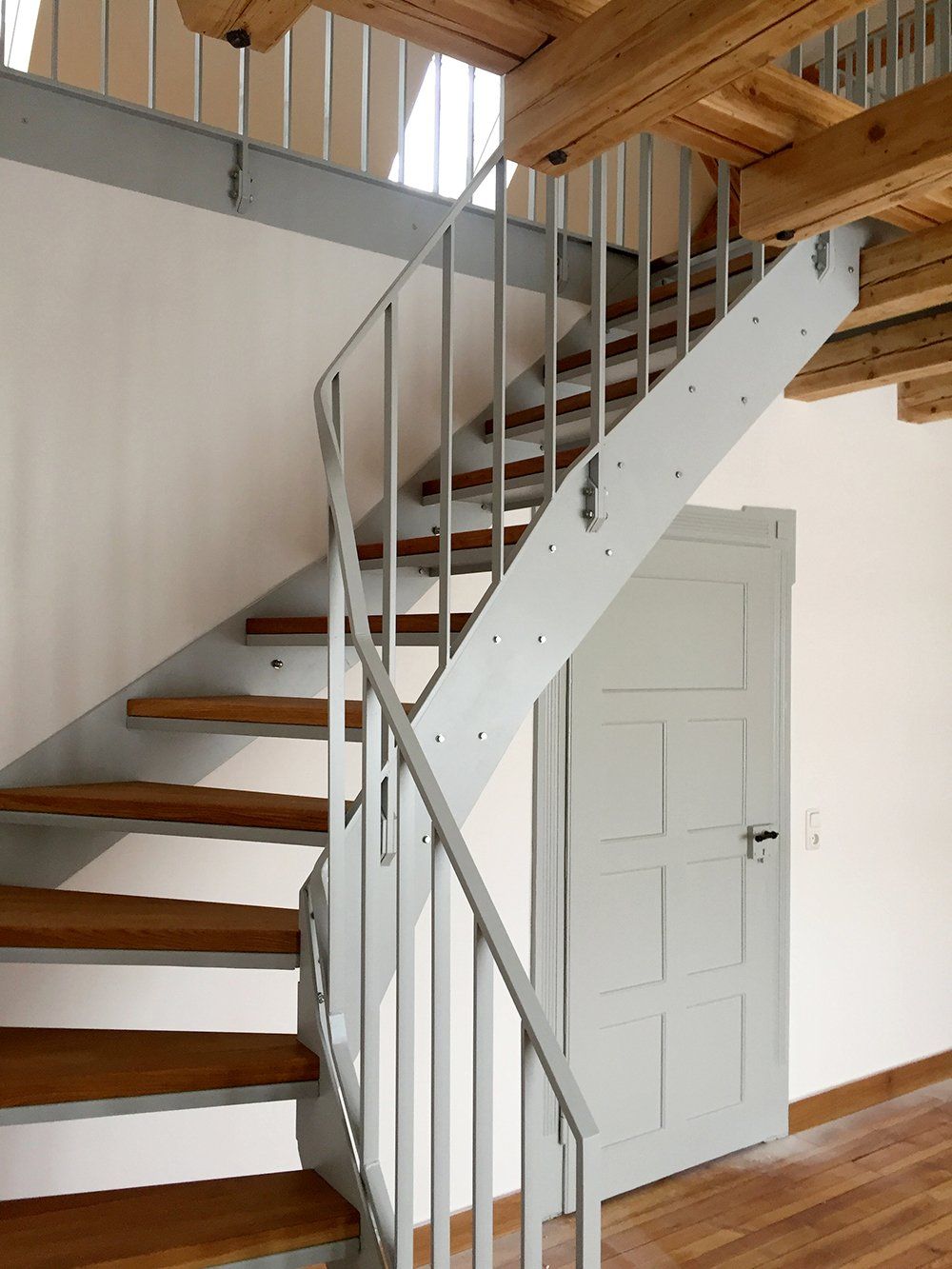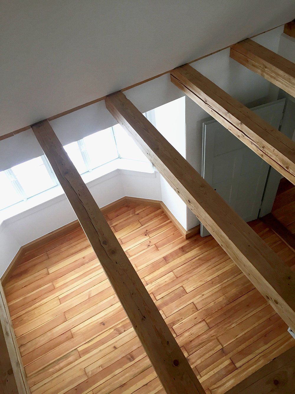 durchaus schätzen, eine wahre Fundgrube. Und glücklicherweise deckte sich unsere Sichtweise komplett mit der unseres Bauherren, der das Gebäude zwar auf „vermietungstauglichen“ Stand bringen wollte, sich des Wertes seiner alten Bausubstanz aber durchaus bewusst war. Und so setzten wir viel instand und tauschten wenig aus. Um zu erhalten, was erhaltenswert war, gingen wir den unbequemeren Weg der hohen Arbeitsaufwände und des guten Handwerks. Die über 100 Jahre alten Kastenfenster wurden mit viel Mühe aufgearbeitet und lackiert, die original erhaltenen Holzjalousien und Fensterläden liebevoll restauriert oder detailgetreu nachgebaut, das unnachahmlich schöne Parkett von mehreren Schichten Teppich und PVC-Belag befreit und abgeschliffen. Die vorangegangene enge Abstimmung mit dem Bauamt ermöglichte uns bzgl. des Brandschutzes bauliche Lösungen, die dem Erhalt der alten Bauteile Rechnung trug. Ein einheitliches Farbkonzept für den Außen- wie auch den Innenraum sollte einen frischen Fokus auf die bemerkenswerten Details des Gebäudes lenken, ohne sich als „Farbspiel“ in den Vordergrund zu drängen. Neben der Instandsetzung der 3 vorhandenen geräumigen Etagenwohnungen haben wir den Dachraum zu einem neuen Galeriegeschoß ausgebaut, welches die Wohnfläche der obersten Wohnung erheblich erweitert. Durch den Einbau von 3 schmalen, aber bodentiefen Lichtbändern auf der Hofseite und einem Dreiecksfenster im Walmgiebel konnten wir einen atmosphärisch hochattraktiven Raum schaffen, ohne die Außenfassade des Gebäudes zu beeinträchtigen.
